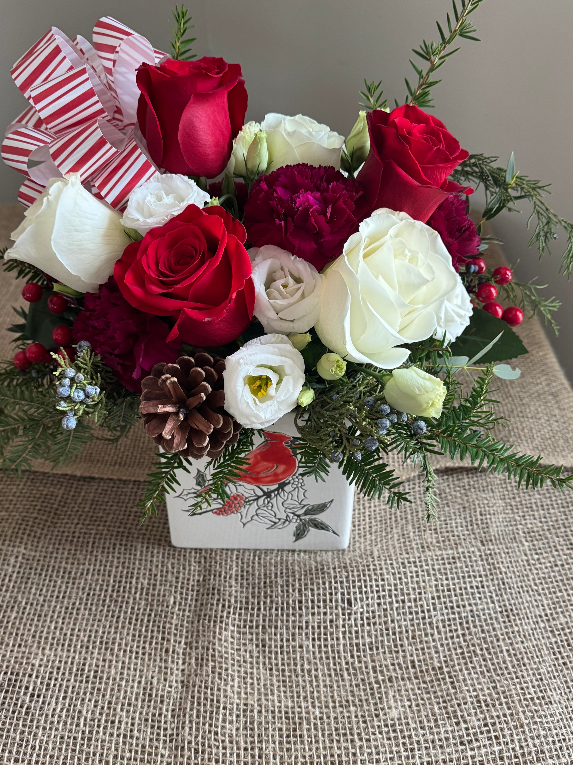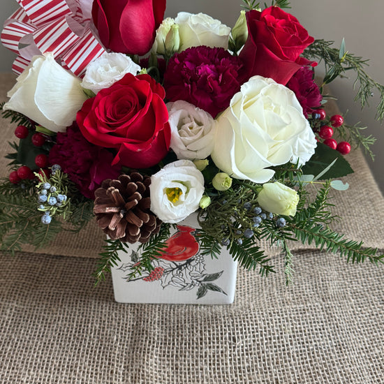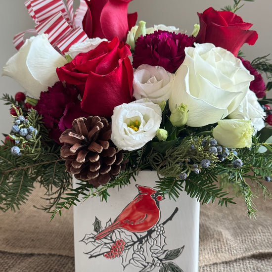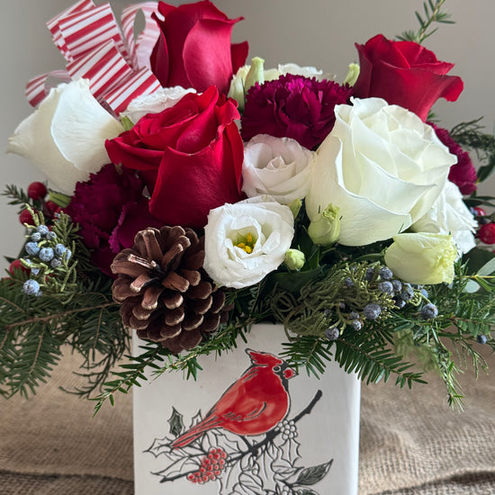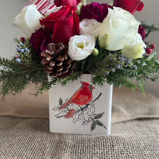 Send a message of warmth, hope, and holiday cheer with Cardinal Winter Wishes, our handcrafted seasonal arrangement designed in a charming ceramic cardinal container. Symbolizing love, remembrance, and the magic of winter, this piece brings meaning and beauty to any home during the holiday season.