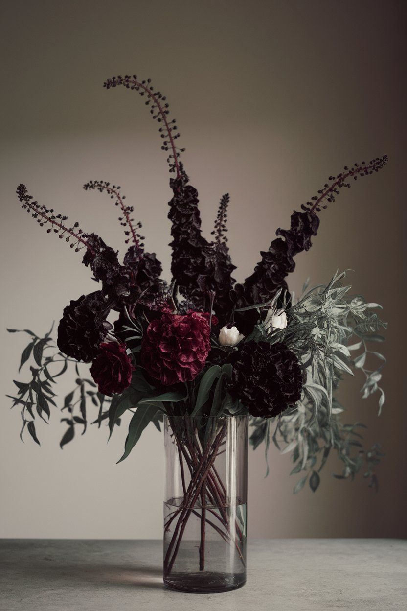Dark romance meets clean lines. This moody arrangement pairs deep-toned fresh blooms, preserved roses, textured pods, and trailing amaranth in a tall clear hurricane glass vase for a dramatic, sculptural statement. The transparent vase lets the stems read as part of the composition while the lush, shadowy blooms create rich contrast — perfect for a dining table, entryway, or a luxe gift.