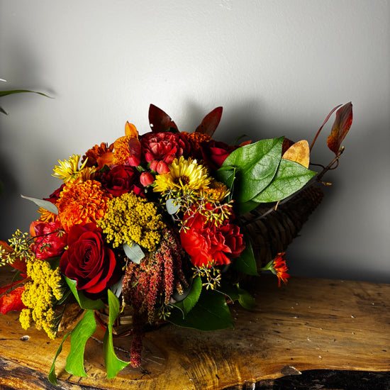 Celebrate the abundance of fall with our hand-crafted Harvest Cornucopia, overflowing with locally grown blooms, textural grasses, and autumn foliage. Designed in our studio with seasonal treasures sourced from Connecticut farms, each piece captures the warmth and gratitude of the season — perfect for Thanksgiving tables, hostess gifts, or cozy home décor.
