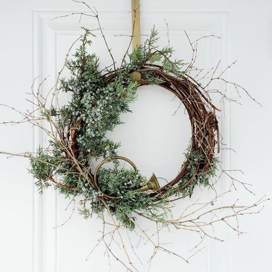 A clean, contemporary take on the holiday wreath using a grapevine or metal base and asymmetrical design.