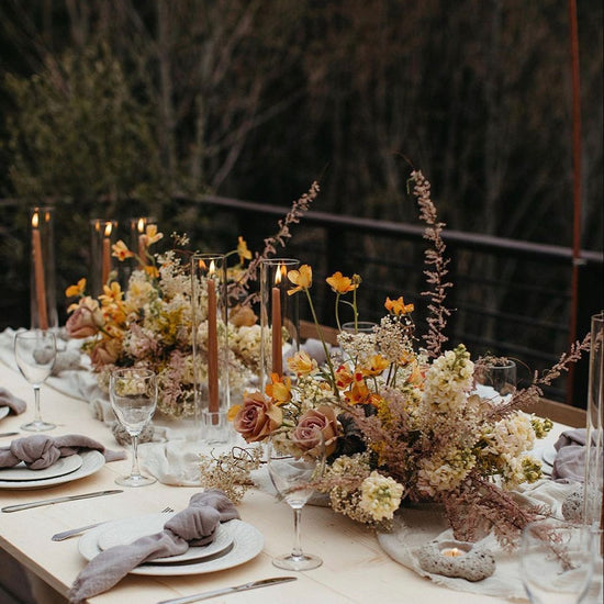 Want a longer tablescape? Additional feet are available onsite for $79 per foot (payable during class). We’ll demo how to join sections, style around candles and glass decor, and pack pieces for safe transport home.