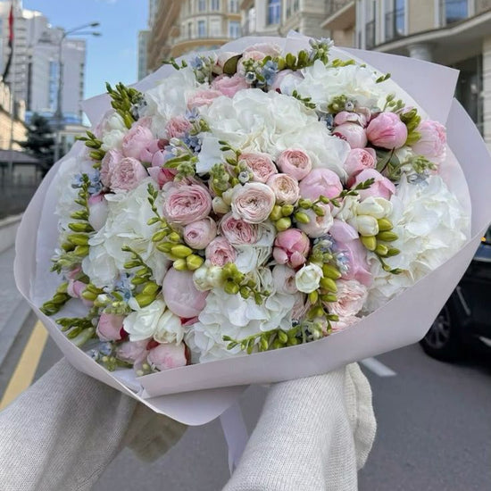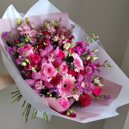 A bold and abundant hand-tied luxury bouquet designed from seasonal premium flowers—roses, anemones, ranunculus, tulips, hydrangea, orchids, lilies, peonies, and a rotating sweet selection. May not be exactly as pictured. Delivered in a bucket or very large vase