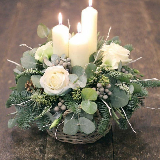 Bring the quiet magic of the forest to your table. Our Woodland Candle Centerpiece is a lush, low-profile arrangement designed to glow beautifully from every angle. Featuring seasonal evergreen foliage, eucalyptus, textural accents, and soft white blooms, this piece is anchored with elegant pillar candles for a warm, inviting ambiance.